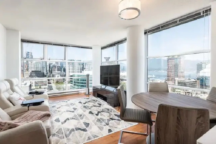 This stylish 816 Sqft. 2 bedroom, 1 bathroom plus den apartment is ideally situated in Vancouver’s central “Crosstown” district. From the trendy bars and bistros of Yaletown, the boutique shops of historic Gastown and the lively downtown core, you’ll have the best of Vancouver within a short walk of your doorstep. The open floor plan provides a stunning view of downtown and ample spacing as you walk from the living room to the gourmet kitchen. The kitchen features a handy countertop peninsula in polished granite for a sleek, yet functional design. This stylish gourmet kitchen also offers a brand new silent dish washer, stainless-steel appliances, a built-in wine rack and tile backsplash. The bedrooms are equally well styled and with plenty of space, while the additional multipurpose den can act as your home office or storage. Be amazed by the floor-to-ceiling windows across the corner of the building, affording you fantastic views over the city, water and mountains. In the summer, you can see the cruises docking at the Convention Centre. Sit back and enjoy having your blinds up at night without obstructing views of the beautifully lit Vancouver City. An immaculate bathroom and in-suite laundry with a brand new set of heavy-duty washer and dryer. Sports fans will appreciate being within a short stroll to BC Place Stadium and Rogers Arena, while those who enjoy quality shopping and interesting cafes will be well catered for in the colorful scene of nearby Gastown. This area is located minutes away from the SkyTrain, Costco, TNT and other handy shops for your day-to-day needs. For everything else, look to Spectrum’s residents’ facilities that include a pool, Jacuzzi, fitness center, sauna and steam room. Your rent covers all amenities. Small pets may be considered. Live tours available, please call, text or email to arrange.