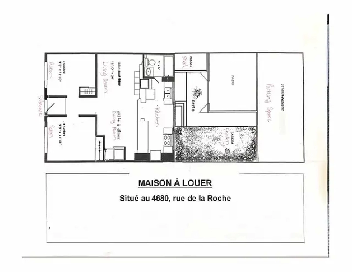 Au cœur du Plateau Mont-Royal (entre l’Avenue Mont-Royal et la rue Gilford) – situé au 4680, rue de la Roche. Maison a un étage, rénovée à neuf, comprenant deux chambres à coucher fermées, salon, salle à dîner et cuisine à aire ouverte. Plancher de bois franc, une grande cour privée avec remise et terrasse en bois traité ainsi que deux stationnements privés situés à l'arrière de la maison. Cette ruelle est déneigée par la ville de Montréal (ruelle Poitevin). Stationnement très rare sur le Plateau Mont-Royal.